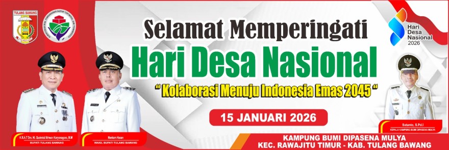 Pemerintah Kecamatan Rawa Jitu Timur melaksanakan Upacara Peringatan Hari Desa Nasional Tahun 2026 pada Kamis, 15 Januari 2026, yang dipusatkan di Lapangan Kecamatan Rawa Jitu Timur. Upacara ini diikuti oleh seluruh unsur pemerintahan dan lembaga terkait, termasuk aparatur Kampung Bumi Dipasena Mulya yang hadir dengan penuh khidmat dan semangat kebersamaan.